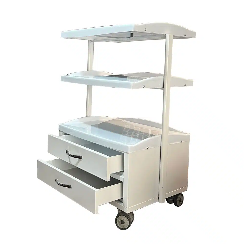 سه طبقه (قفسه): طبقات معمولاً به صورت باز طراحی شدهاند و دسترسی سریع و آسان به ابزارهایی مانند بطریهای مواد، سشوار، اتو مو، دستگاههای بخور، یا کاسههای مورد استفاده در خدمات مختلف را ممکن میسازند. این طبقات، فضای بیشتری برای قرار دادن وسایل پرکاربرد ایجاد میکنند.