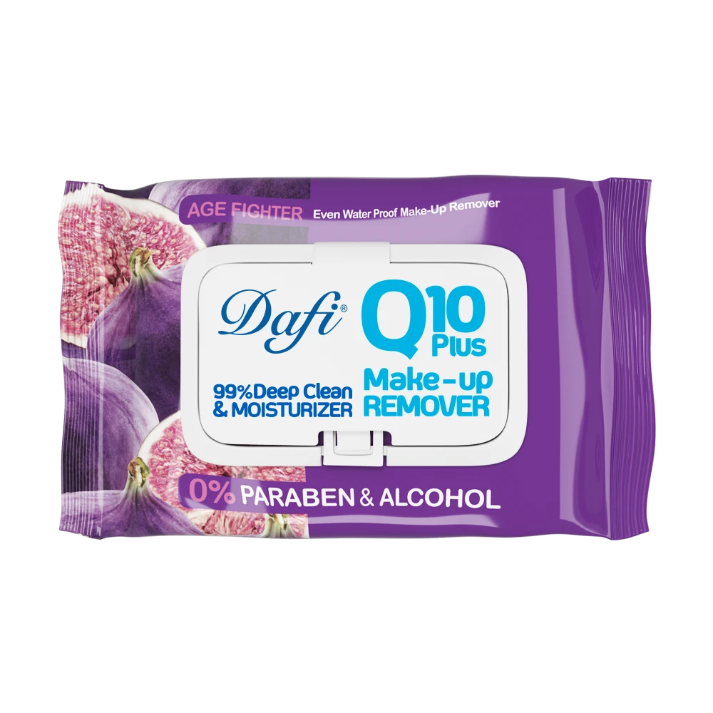 دستمال مرطوب پاک‌کننده آرایش Q10 قوی ترین آنتی اکسیدان می‌باشد که براساس انواع پوست و نیاز طراحی شده است که شامل تنوع های ضدجوش، ضد التهاب، جوان کننده و آبرسان است. حاوی Q10 که یک کوآنزیم است که موجب تسریع سلول سازی پوست، افزایش کلاژن و در نتیجه جوانسازی می‌شود. دستمال مرطوب دافی به حفظ آب میان سلولی بعد از تمیز شدن پوست کمک کرده و موجب آلرژی و حساسیت نمی‌شود. همچنین فاقد پارابن، الکل و صابون است. دستمال پاک کننده آرایش دافی حاوی عصاره انجیر است که موجب شفاف شدن پوست صورت شده و سلولهای مرده پوست را از بین می‌برد و به راحتی آرایش چشم و صورت را پاک می‌کند. دستمال پاک کننده دافی نوع ضد جوش مناسب پوست های چرب، مختلط و جوش دار است و نوع ضد التهاب آن برای پوست حساس و خشک مناسب است.