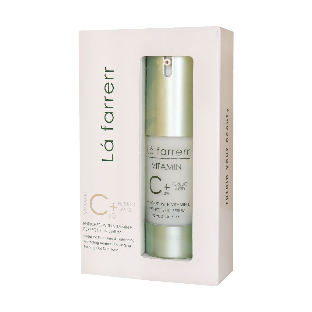 سرم ویتامین سی ۱۰ درصد لافارر یک روشن کننده و ترمیم کننده است که با بهره گیری از ویتامین های C ،E و فرولیک اسید به لایه برداری و جلوگیری از تولید ملانین کمک کرده و در نتیجه از ایجاد لک های ناشی از افزایش سن، بارداری، آکنه و غیره جلوگیری می کند. سرم ویتامین سی ضد پیری لافارر ضمن رطوبت رسانی به پوست صورت، کاهش سایز منافذ و جلوگیری از ایجاد آکنه، موجب کاهش التهابات و حساسیت های پوستی نیز خواهد می شود. جلوگیری از فعالیت رادیکال های آزاد، پیشگیری از بروز علائم پیری، کمک به افزایش تولید پروتئین های کلاژن و الاستین، کاهش چین و چروک، روشن شدن پوست و افزایش لطافت و شادابی آن از دیگر مزایایی است که با خرید سرم ویتامین سی لافارر حاصل می شود.